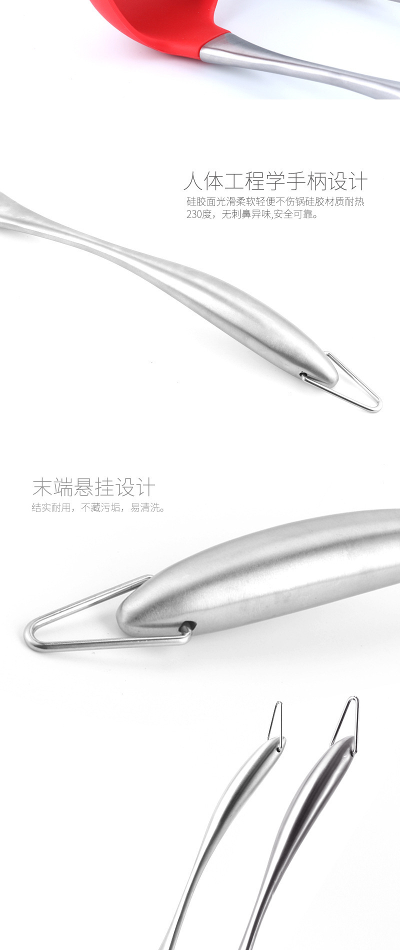 2、人體工程學(xué)手柄設(shè)計,硅膠面光滑柔軟輕便不傷鍋,硅膠材質(zhì)耐熱250℃,無刺鼻異味,安全可靠