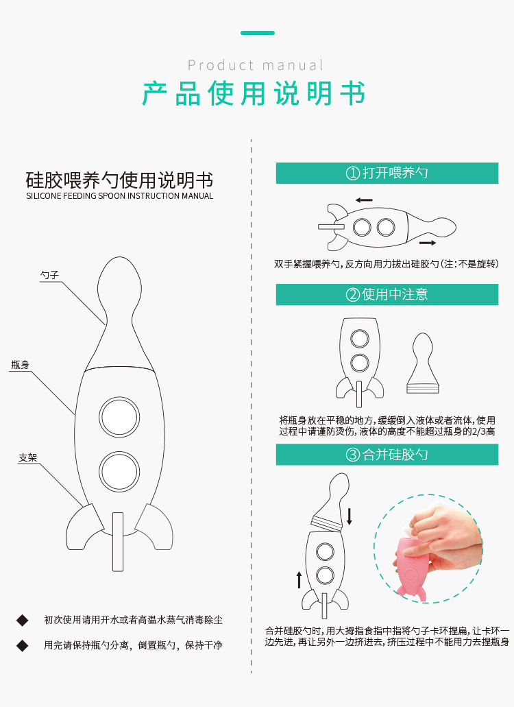 1、碗勺一體,輕松喂養,擠壓式設計,解放雙手,解決喂養煩惱