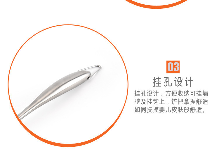 2、手柄采用優(yōu)質(zhì)不銹鋼制作,流線型的手柄設計,增加了鍋鏟本事的強度,防滑防燙,握感舒適
