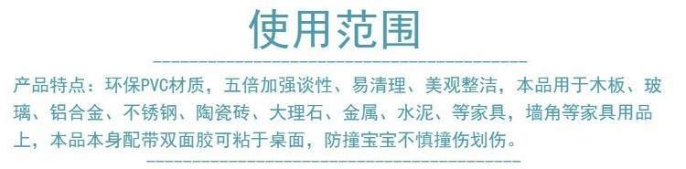 【適用范圍】: 安全又美觀,即讓寶寶和您的家人免受碰撞之苦,同時又不妨礙家具整體造型。適用于一般家庭中的桌角/床角/書柜/玻璃茶幾/樓梯角等容易產生危險的位置