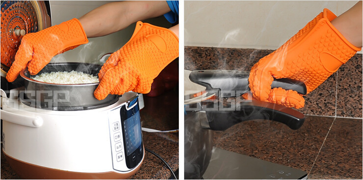 產品特點:環保食品級硅膠材質手感柔軟,,無毒無異味,使用靈活不影響使用,手套外部安全防滑凹點設計,耐高溫200℃以上,給雙手全方位隔熱保護。